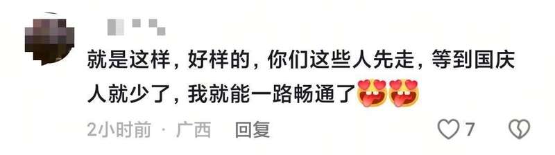 有网友看到此情此景,灵机一动地说:“你们这些人先走,等到国庆假期人就少了,我一路畅通。”