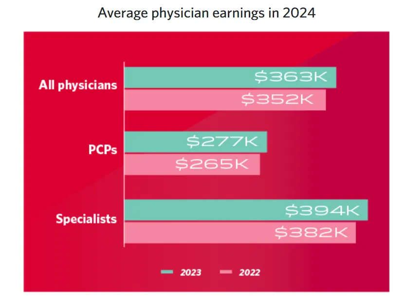 就以收入为例,根据美国最新的《2024年医生薪酬报告》(Physician Salary Report for 2024)显示:2024年,美国所有医疗机构的医生平均收入为36.3万美元。