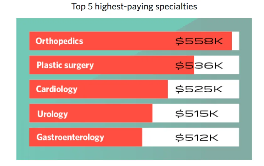 在29个医疗专业中,收入最高的专业分别是:骨科(55.8万美元)、整形外科(53.6万美元)、心脏病学(52.5万美元)、泌尿科(51.5万美元)和胃肠病学(51.2万美元)。