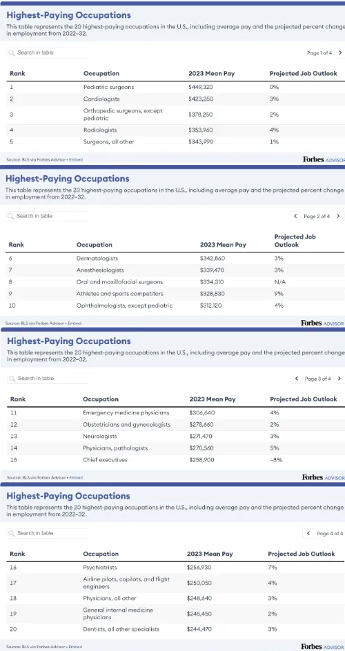 如果横向与其他行业对比,根据《福布斯》去年的调研显示:美国收入最高的20个职业里,除了首席执行官(位居15)和飞行员(位居17)之外,其它全是医生(不同专业)。