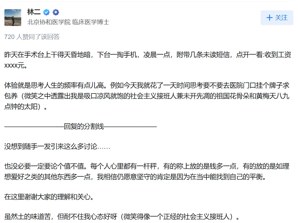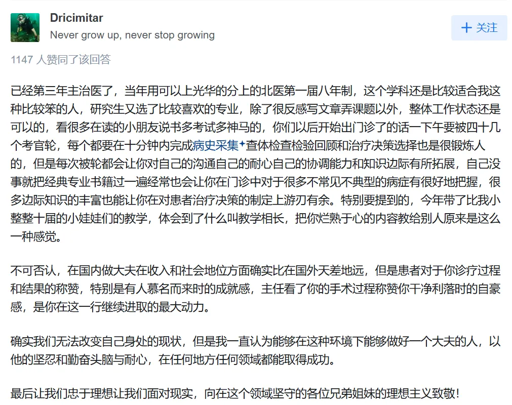 在国内,医生是一份能兼顾稳定性、收入水平、尊重度、职业生命线、社会贡献、惠及家人的好工作。无论从何种标准评价,都很难舍弃。