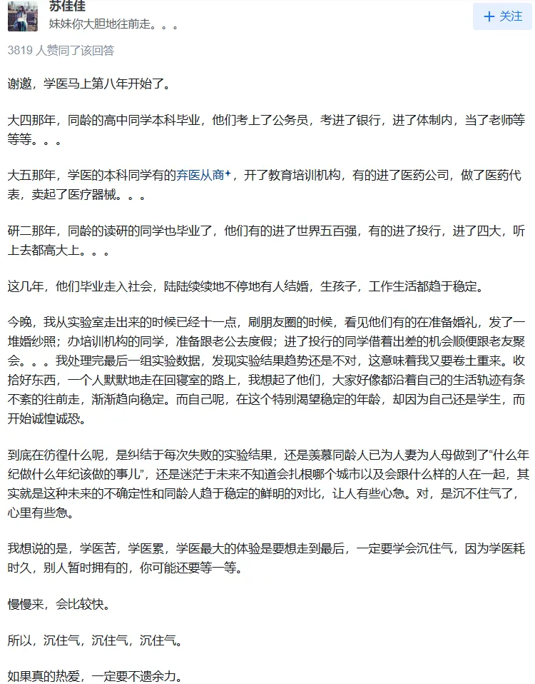 以及,看到同龄人按部就班往前走,而自己还只能在高龄以“学生”身份为实验、考试、病例挣扎时也没有放弃。