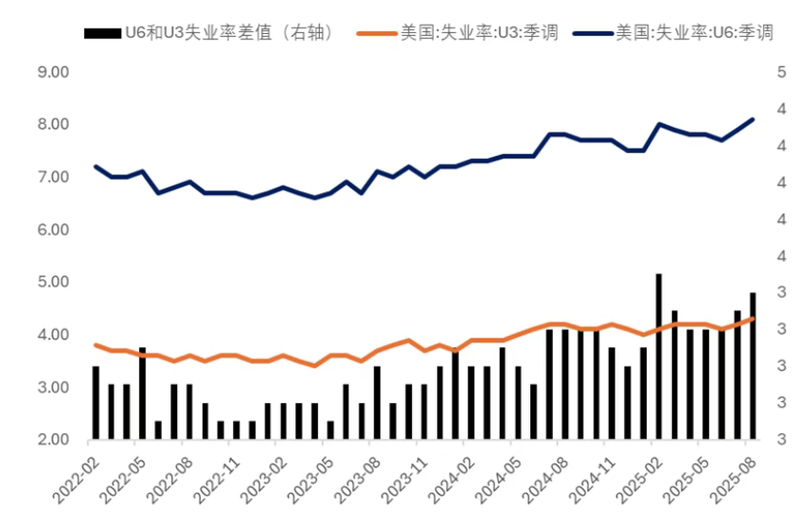 U-6指标与失业率的差,经济正常时应该在3%以内,超过 4%,说明就业质量下降,兼职/隐性失业增加。
