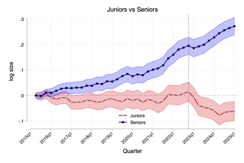 哈佛大学两位劳动经济学博士近期有一篇论文《生成式人工智能作为偏重资历的技术变革:来自美国简历和职位发布数据的证据》,分析了包括285,000家招聘公司,6200份简历和超过1.5亿次的招聘记录,揭示了AI对就业市场已经发生的冲击。