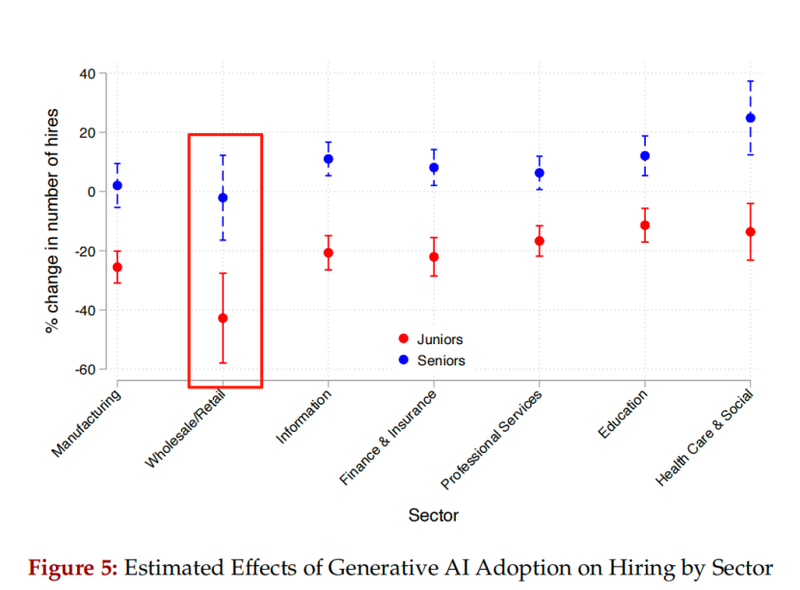其中的逻辑也非常好理解,下降最多的行业是批发零售业,员工中初级岗位大多与文书、客服有关,也是AI目前最得心应手的领域。