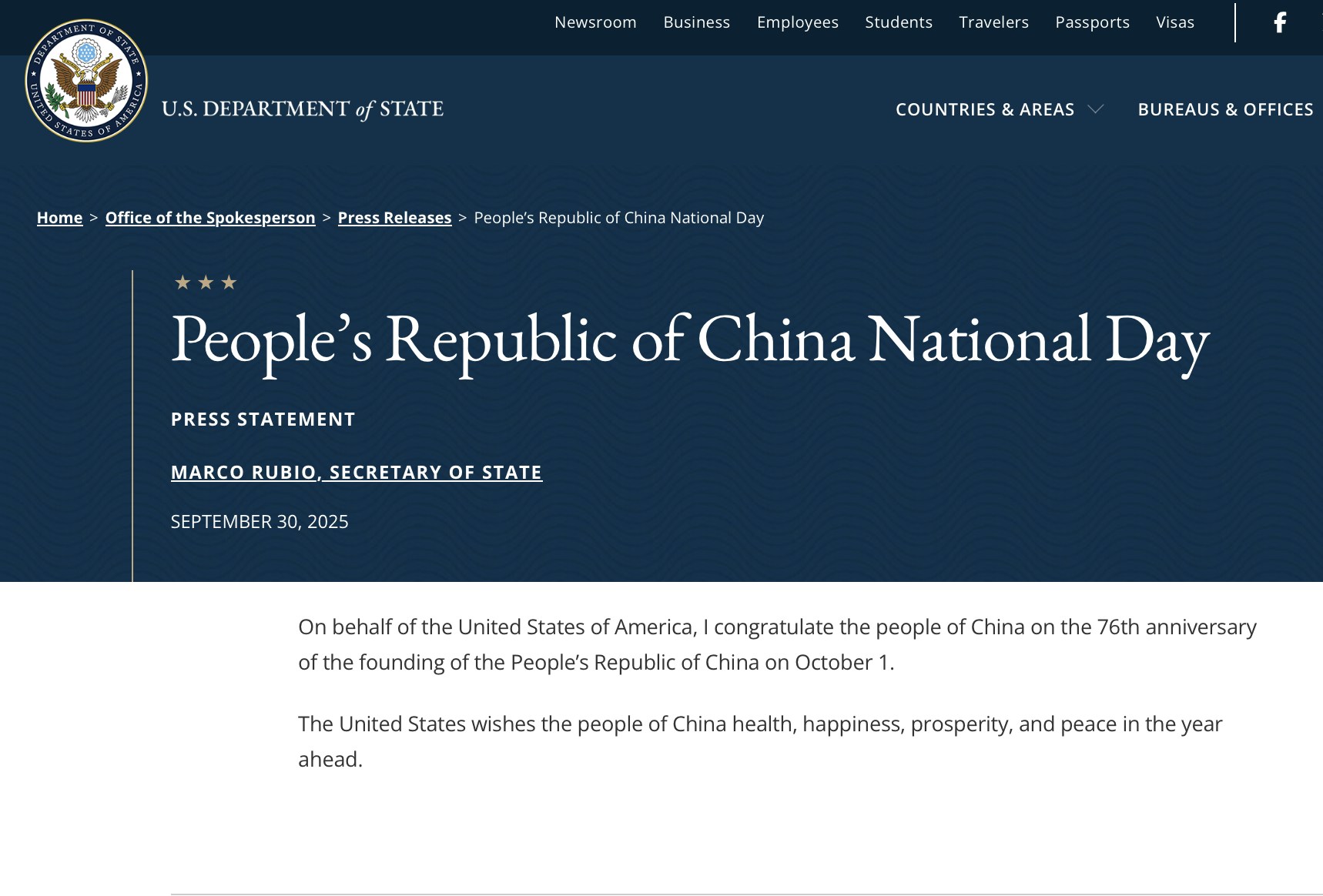 来源:倍可亲(backchina.com)美国国务院今年恢复惯例,国务卿鲁比奥(Marco Rubio)于中国10月1日国庆前夕发布声明,代表美国向中国人民在中华人(专题)民共和国成立76周年之际表示祝贺。