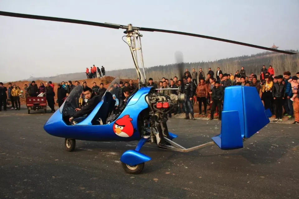 2013年,河南洛阳,一小伙开一架自己制造的直升飞机前去一庙会,引数万观众围观。(图/视觉中国)