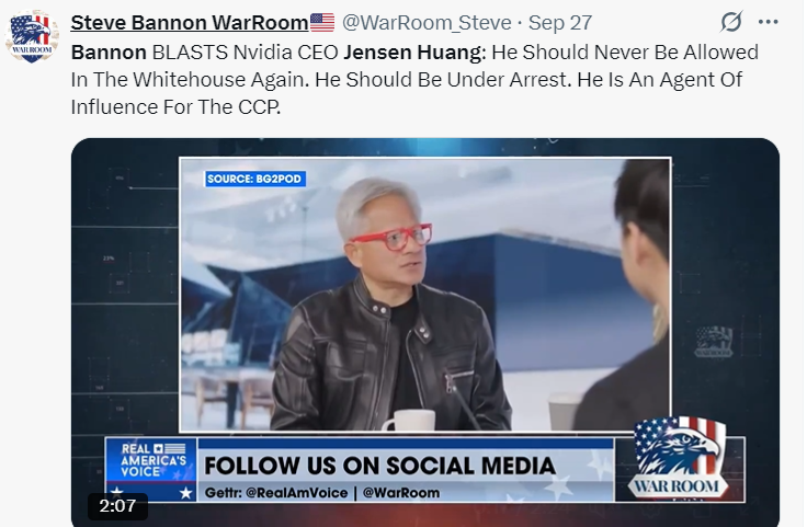 2016年总统选举担任川普竞选团队总干事班农在自己的播客节目“战情室”(War Room)中称黄仁勋是中共影响力代理人,应该遭到逮捕,且不应再被允许进入白宫。