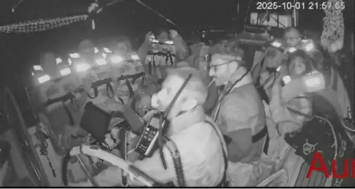 有视频画面显示,10月1日,“全球坚韧船队”船员正坐在驶往加沙的船上。图源:外媒