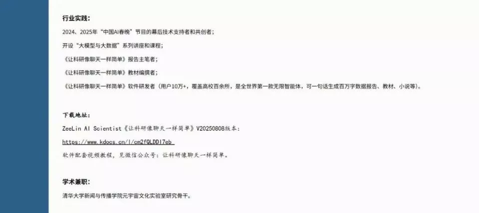 她还是《让科研像聊天一样简单》报告主笔者、教材编撰者,《让科研像聊天一样简单》软件研发者(用户10万+,覆盖高校百余所,是全世界第一款无限智能体,可一句话生成百万字数据报告、教材、小说等)。