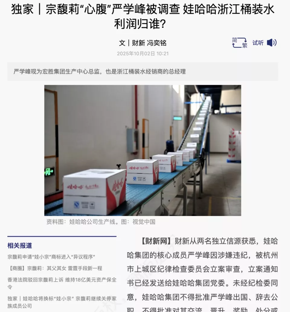 报道援引独立信源称,娃哈哈集团的核心成员严学峰因涉嫌违纪,被杭州市上城区纪律检查委员会立案审查,立案通知书已经发送给娃哈哈集团党委。