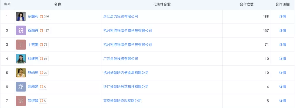 他与娃哈哈集团董事长宗馥莉和宏盛饮料集团法定代表人祝丽丹合作均超150次,后者则是宗馥莉的绝对“心腹”。