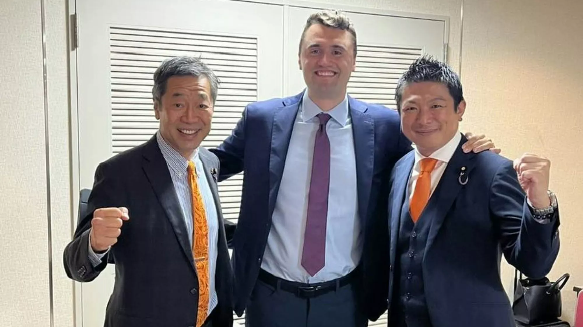 2025年9月8日,日本参政党党魁神谷宗币(右)和议员山中泉(左)在日本东京与前来出席活动的美国右翼名嘴柯克(Charlie Kirk)合照。(X@SenYamanaka)