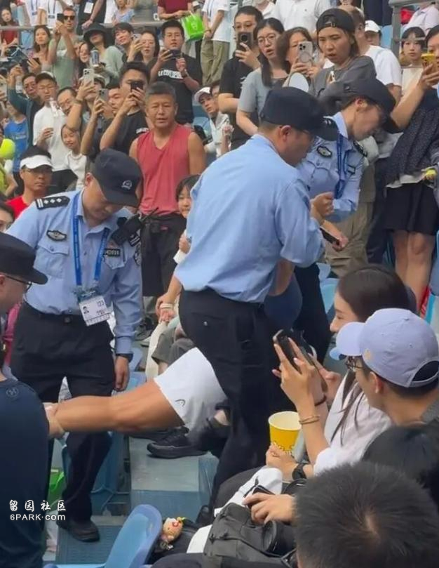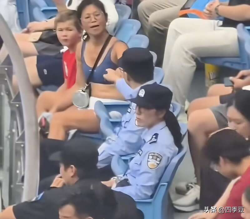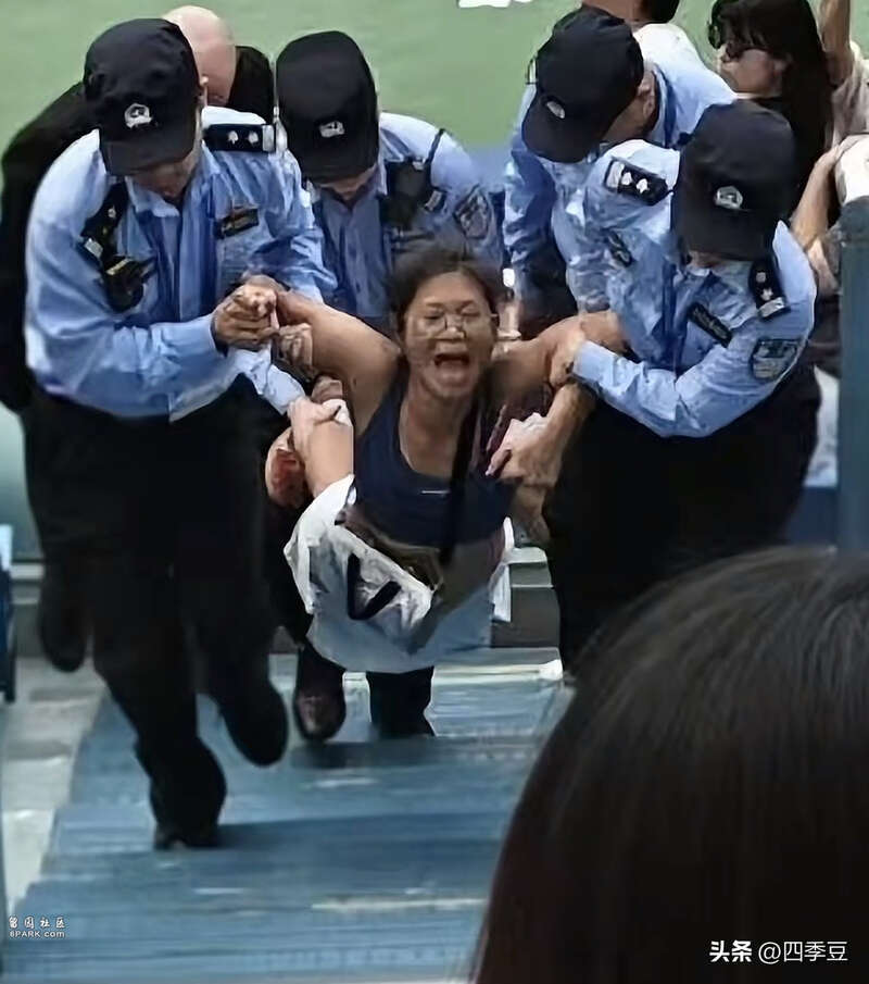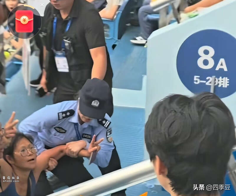 就多人把他给抬出了比赛的观众区,当时抬出去的时候,我们看镜头,这个女子还对着周围观众的镜头比个耶,说明对自己的行为非常满意