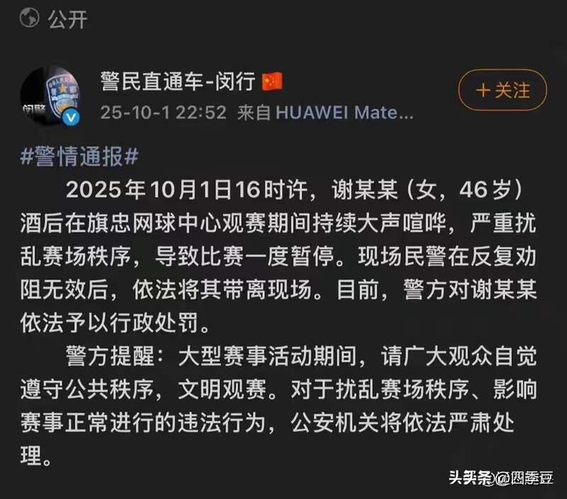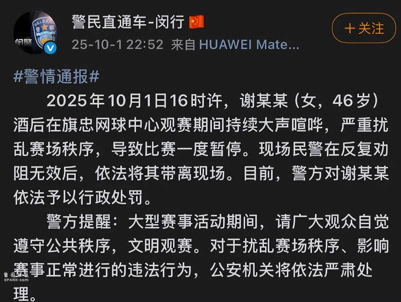 2025年10月1日16时许,在ATP1000上海网球大师赛意大利球员贝雷蒂尼与法国球员马纳里诺的比赛中,46岁的谢某某酒后在旗忠网球中心观赛期间持续大声喧哗,严重扰乱赛场秩序,导致比赛一度暂停。现场民警在反复劝阻无效后,依法将其带离现场,警方已对谢某某依法予以行政处罚。