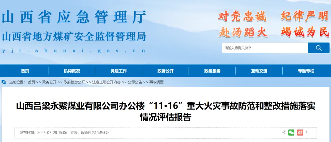 《山西吕梁永聚煤业有限公司办公楼“11·16”重大火灾事故防范和整改措施落实情况评估报告》(以下简称“评估报告”)