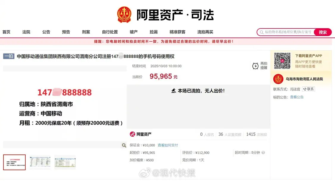 阿里资产拍卖页面显示,此次拍卖的手机号为147**888888,该号码运营商为移动公司,号码归属地为陕西省渭南市。在标的物介绍中,明确载明该号码为移动靓号,有最低消费,每月最低消费2000元,新用户需要预存2万元,合约期是20年。该号码的市场评估价为11.29万元,第一次拍卖降价15%,起拍价设置为9.5965万元,竞拍保证金1万元。10月3日,在24小时的竞价周期里,始终无人出价,这也宣告了该号码易主失败。