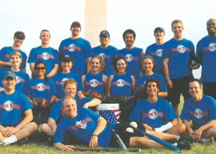▎在美国的三年中,小泉进次郎加入了一个由在各类企业、非政府组织、政府机构等工作的人组成的垒球队。