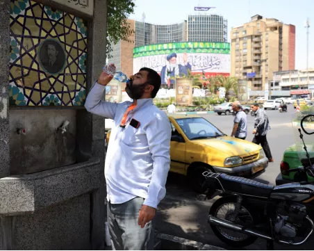 7月,德黑兰气温高达40摄氏度,一名男子在公共饮水处喝水。图源:《卫报》