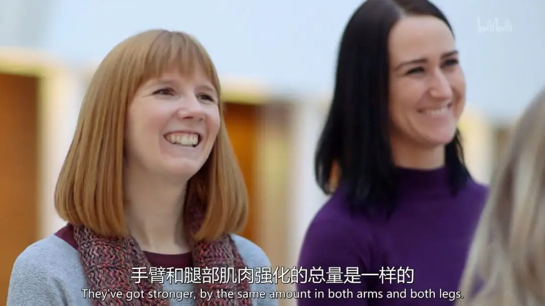 她们双手肌肉都强化了 18% -19%,双腿肌肉也都强化了 25%,并没有因为两边受重不同而有差别。