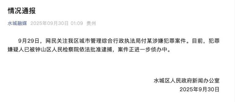 陆媒指出,截至9月29日中午,付某的个人简历仍然挂在水城区政府官网上,但随着消息透过网络飞快扩散,在2小时后简历便被撤下,象征其已经落马。 当地政府更在30日凌晨发布通报称,付某已被钟山区检察院批准逮捕,案件正在进一步侦办中。