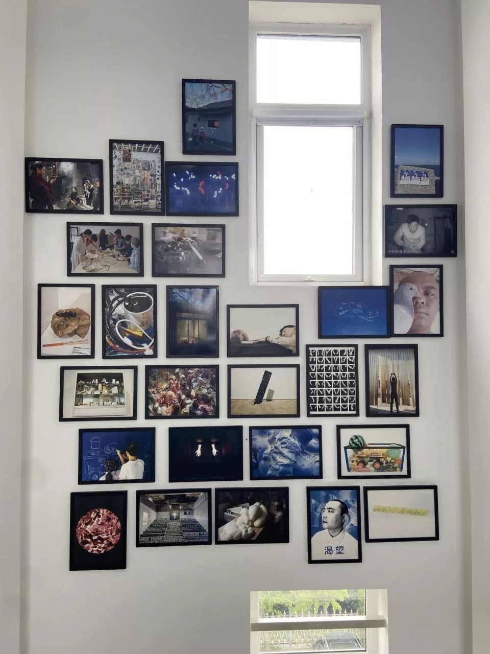 在歌德学院展览中,曹春智用木头打造了简易鸽笼,把自己拍摄的鸽子照片贴在里面。(受访者供图)