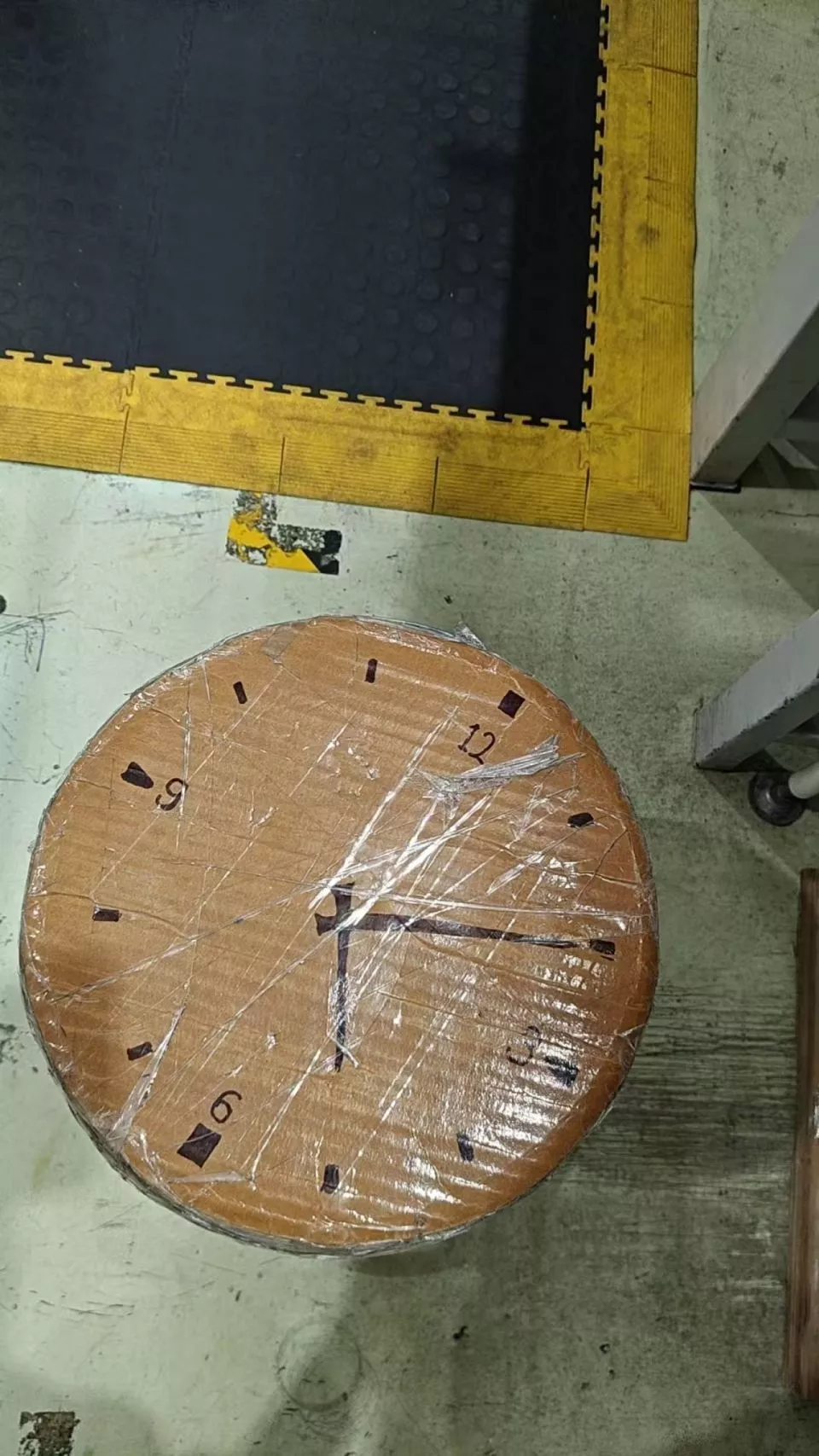 工友用包装箱的纸板自制的坐垫上画着一块钟表,时针指向下班的时间。(受访者供图)