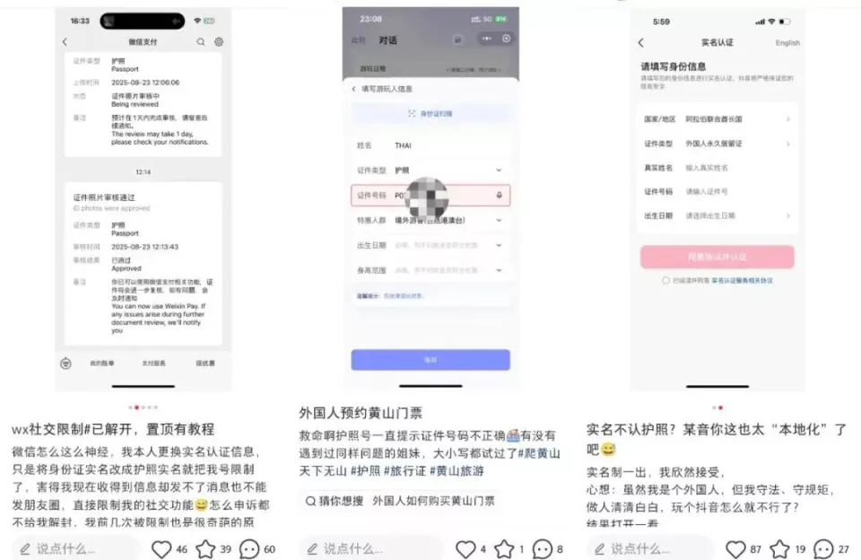 在中国,几乎所有的基础服务,从支付、交通到社交平台的注册,都围绕着二代身份证构建,它和公安、社保、银行、税务等数据绑定,而外国人的护照信息,仅存于入境管理部门,未能打通各项社会服务系统,因此他们就得面临“注册不了”“验证不通过”“功能被限制”等尴尬处境。