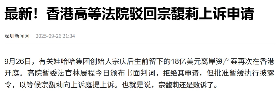 先说一点香港(专题)的事,法院驳回宗馥莉上诉申请。