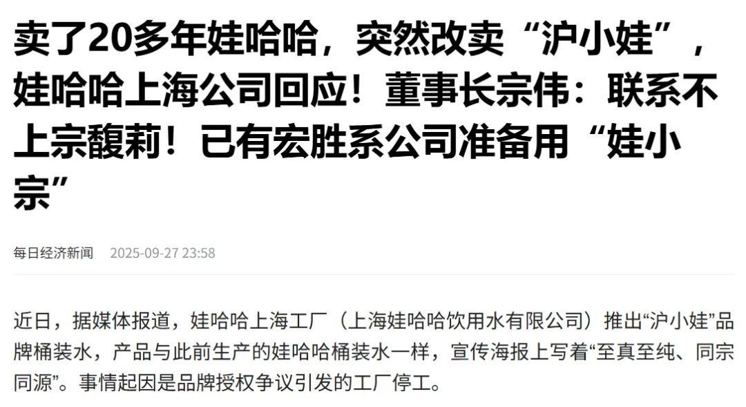 2025年7月,娃哈哈集团(董事长是宗馥莉)要求上海饮用水停止使用“娃哈哈”品牌授权生产桶装水,然后上海饮用水被迫启用“沪小娃”品牌桶装水。