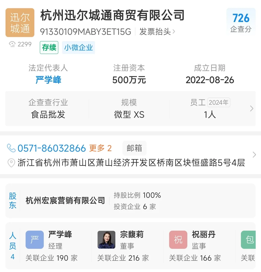 迅尔的100%持股企业是杭州宏宸营销有限公司,法人是严学峰,宗馥莉是董事。