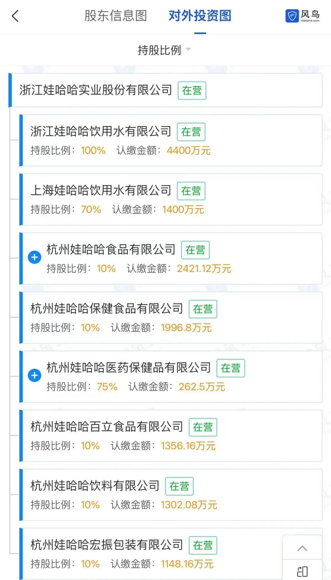 上海娃哈哈饮用水的大股东是浙江娃哈哈实业股份有限公司(简称“浙江实业”),浙江实业持股70%,娃哈哈集团又占有浙江实业43%的股份,内部员工持股约31.5%,社会资本持股约25.5%。