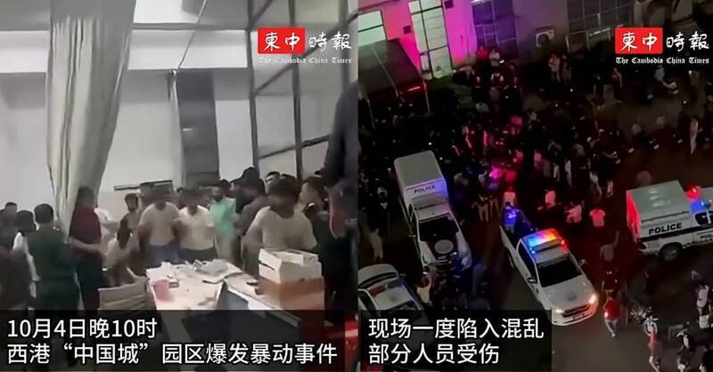 位于柬埔寨西南沿海施亚努省首府的施亚努市,传出当地“中国城”园区于昨(4)日深夜发生大规模暴动。 (图撷取自“柬中时报”YouTube,本报合成)
