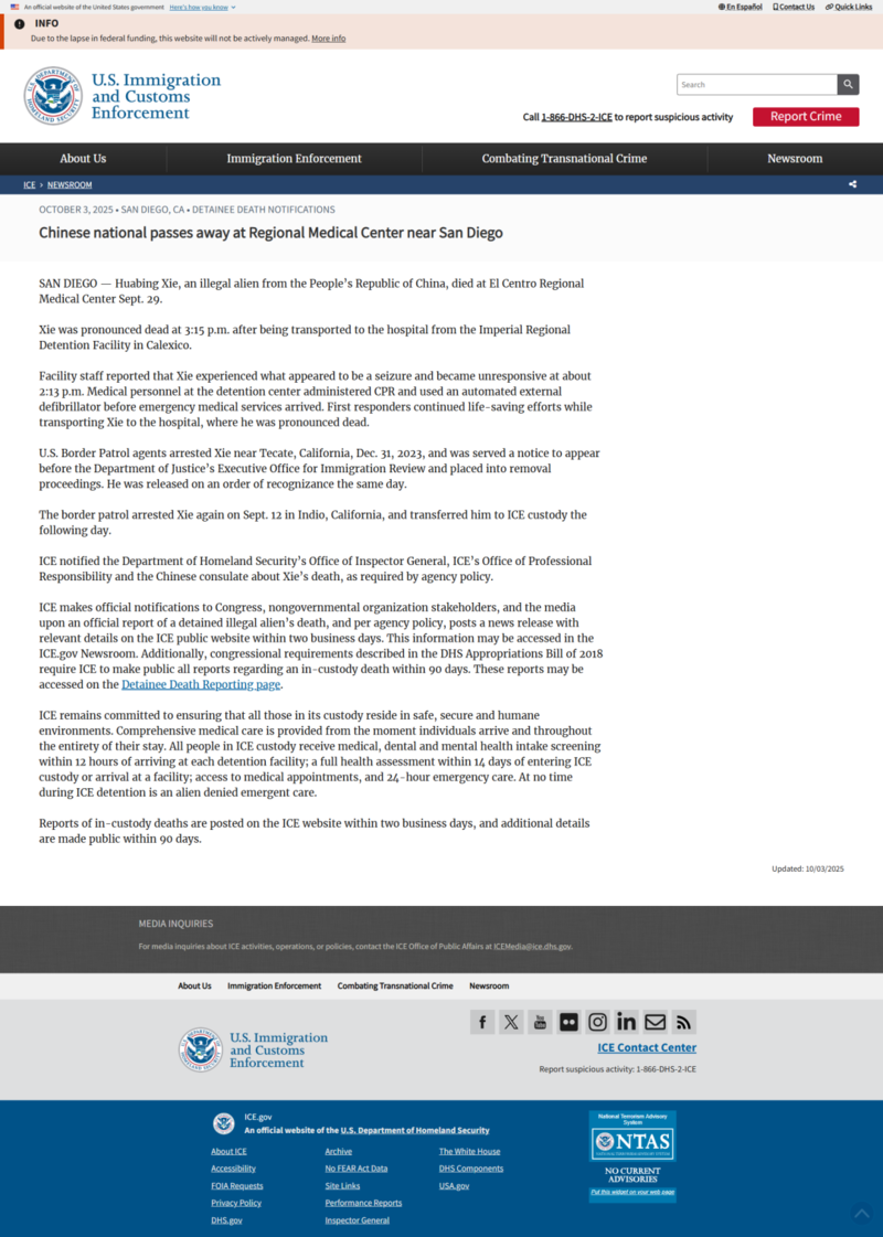 根据ICE的通报,死者名叫谢华兵(Xie Huabing,音译),于9月29日下午3时15分在南加州埃尔森特罗地区医疗中心(El Centro Regional Medical Center)被宣布死亡。他是在加利西哥(Calexico)帝国地区拘留所(Imperial Regional Detention Facility)突发病情后,被紧急送医抢救。