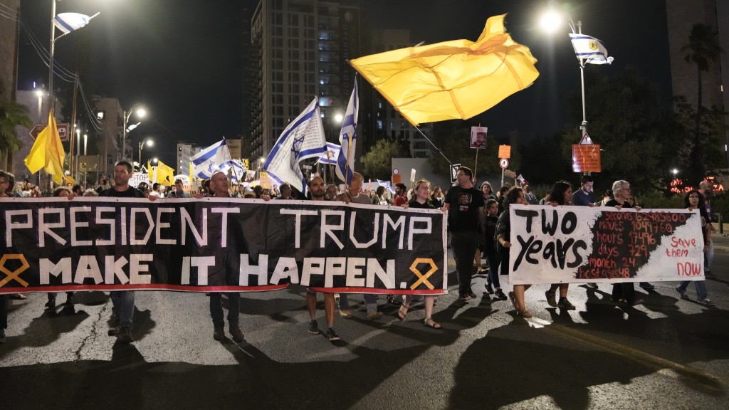在哈马斯袭击以色列两周年前一个星期六的10月4日,耶路撒冷以色列总理住家外,由以色列人质家属举办的反政府示威高举标语,呼吁川普实现他们的愿望。 (法新社)