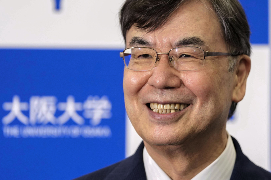 2025年诺贝尔生医奖得主之一坂口志文,6日在任教的大坂大学召开记者会,笑容满面。(美联社)