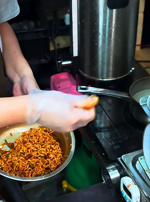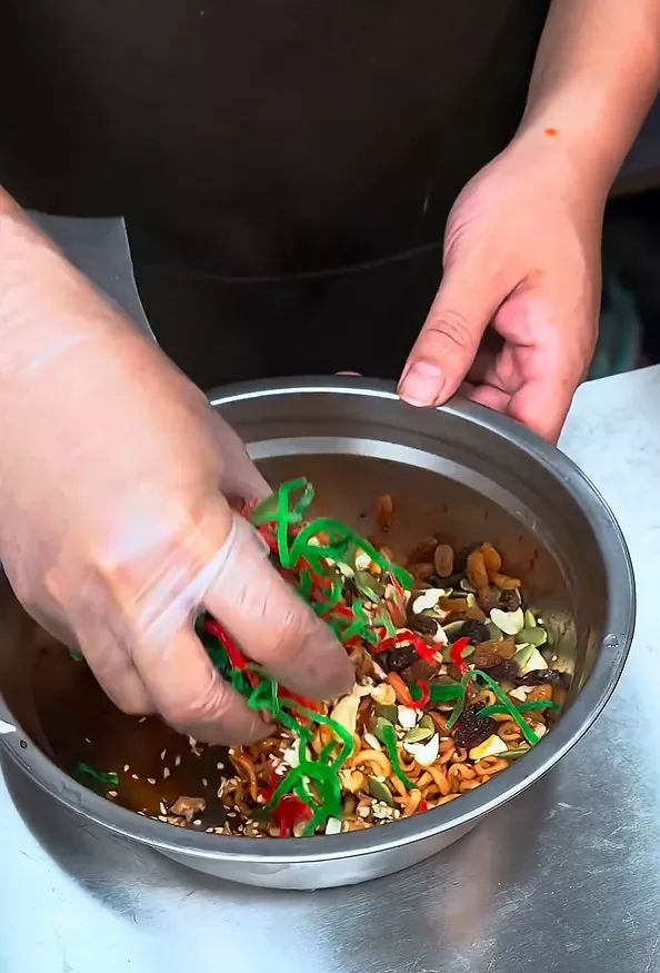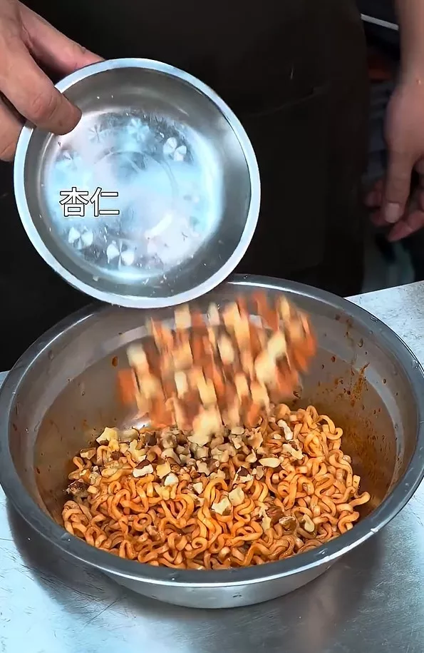 从浙江厨师“Ayu速食”上载的视频看到,他先将方便面煮好,还放入南瓜子、杏仁、腰果、核桃仁、芝麻、葡萄乾等配料,然后搅拌在一起。