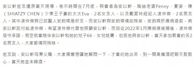 当时台媒拍到安以轩与三名异性同框的画面,引发了不少猜测。后来安以轩的闺蜜受访表示,当天一起聚会的还有陶喆的太太,以及多位同性友人。