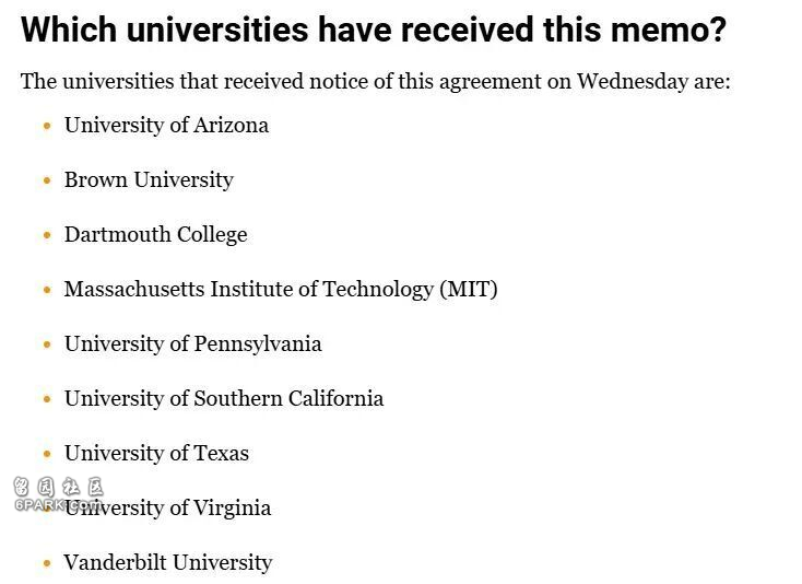 白宫最近向宾夕法尼亚大学、布朗大学、达特茅斯学院、麻省理工学院、范德堡大学、南加州大学、弗吉尼亚大学、德克萨斯大学奥斯汀分校及亚利桑那大学发送一份文件。