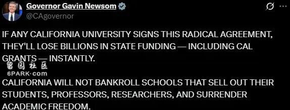 在一份全是大写的声明中,加文·纽森强烈表示,加州"不会资助那些出卖自己的学生、教授、研究人员并放弃学术自由的学校"。