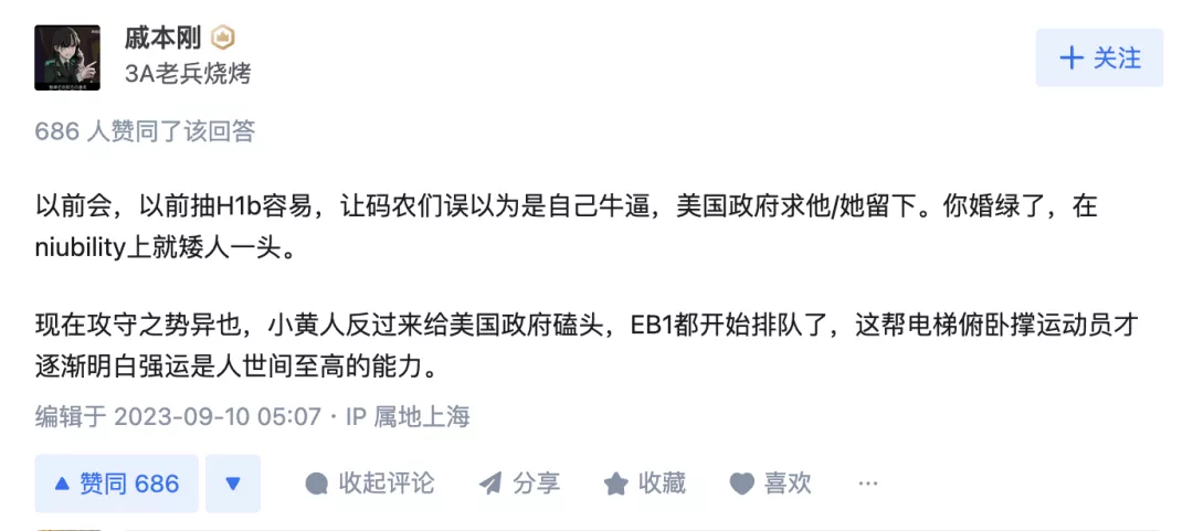 在知乎上,有一篇题为“为了绿卡和美国身份结婚会被人骂吗”的问答,博主“戚本刚”的回答得到了高赞。博主说,婚绿以前会被骂,婚绿的人会觉得“矮人一头”,但现在EB1都开始排队了,“强运”才是人世间至高的能力。