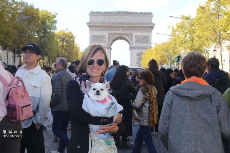 不远处,一只金毛拖着主人跑,一只法国斗牛犬趴在凯旋门前,硬生生成了“网红打卡点”。