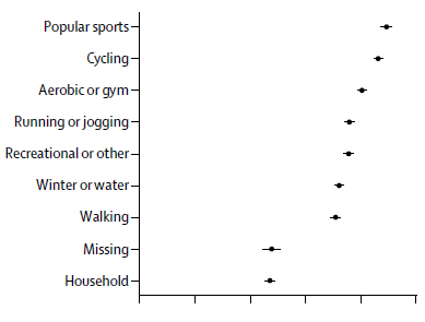 结果如上图所示,第一名是挥拍运动,包含网球、羽毛球,其实也包括在《柳叶刀》研究的第一大类中。