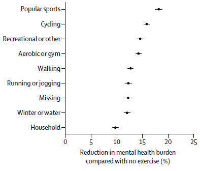 对精神健康而言,总人群中前三名是:团队活动、骑单车、有氧体操——