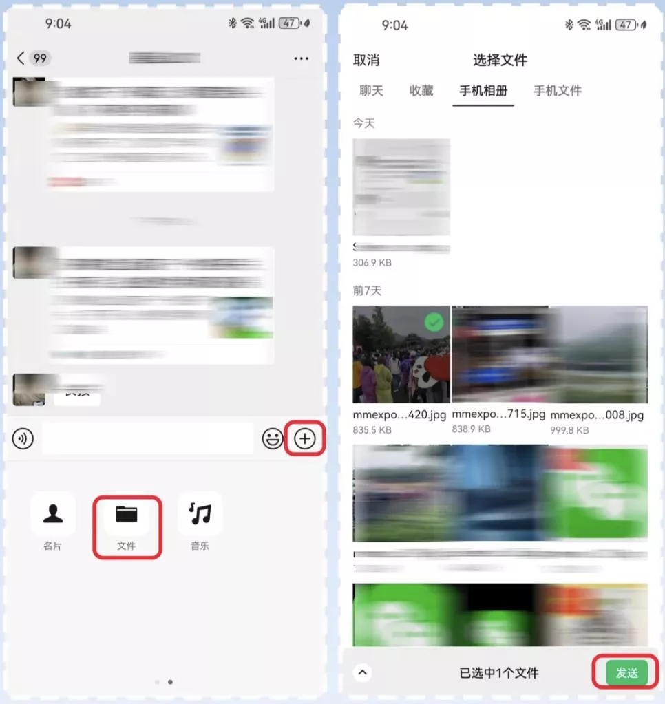打开需要发送照片的好友聊天页面,接着点击+号,然后往左滑动,找到【文件】。点击【文件】-【手机相册】,然后选择需要发送的照片,点击发送。