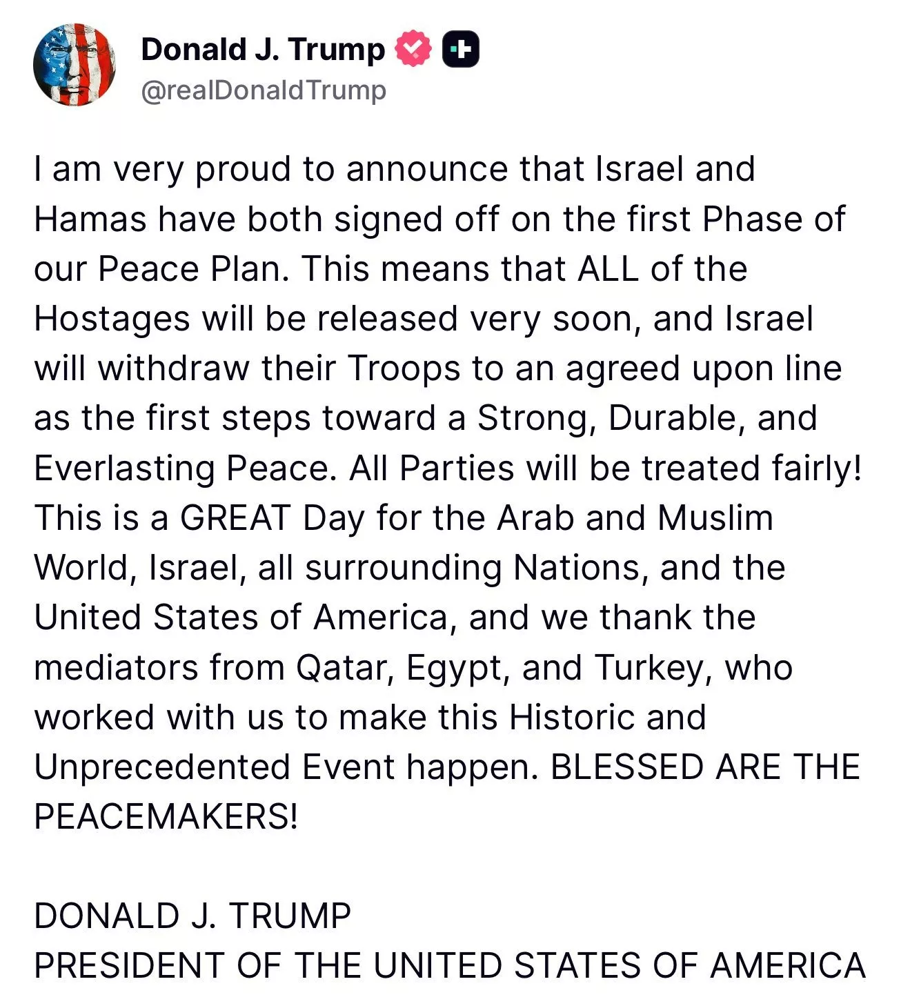 川普周三在社交平台Truth Social上发文,表示:“我很自豪地宣布,以色列和哈马斯都已签署了我们的和平方案的第一阶段(协议),这意味著所有人质将很快被释放,以色列将把军队撤到商定的路线,这是迈向强大、持久和永久和平的第一步。”