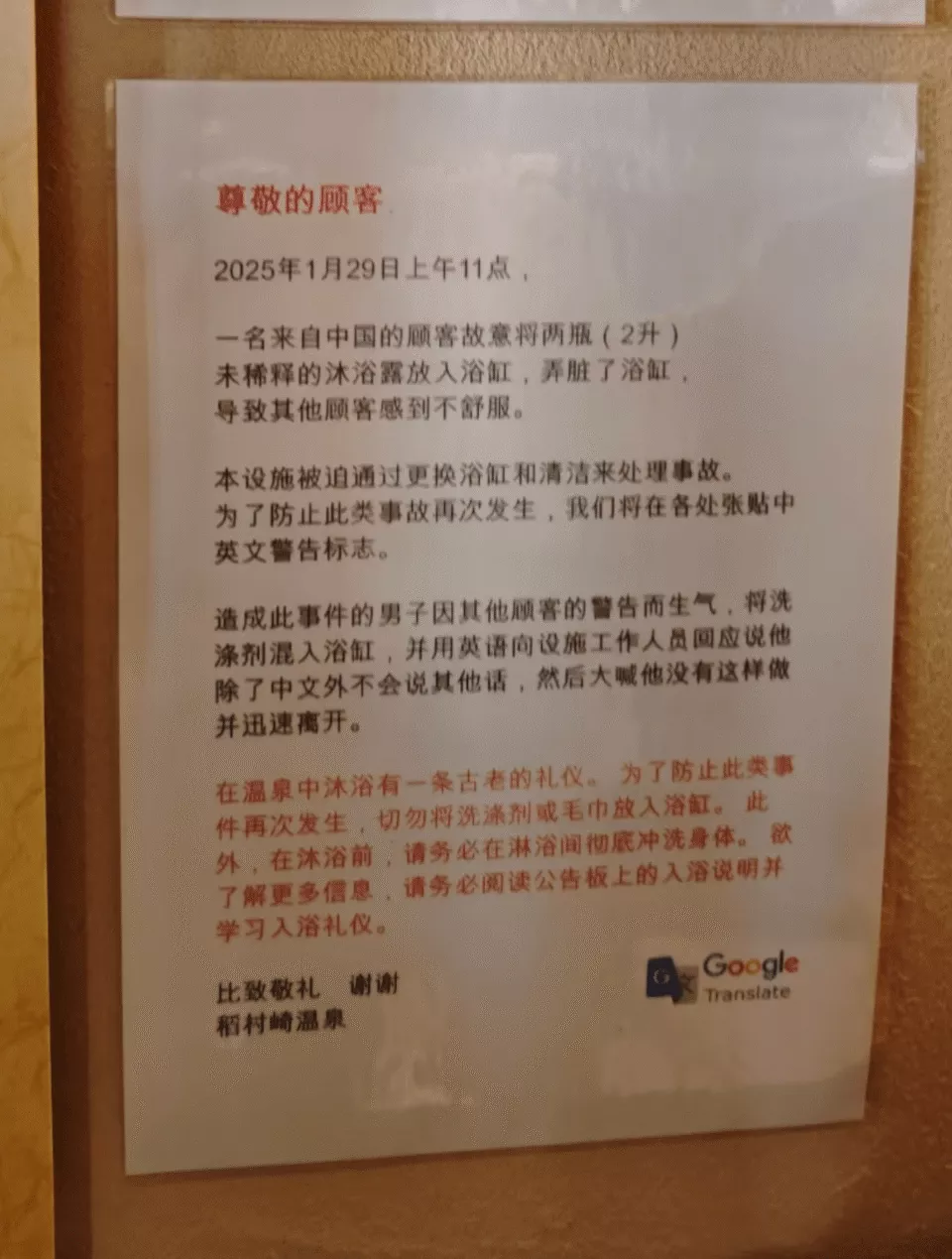 日温泉胜地公告:中国游客将沐浴乳倒入温泉后逃逸