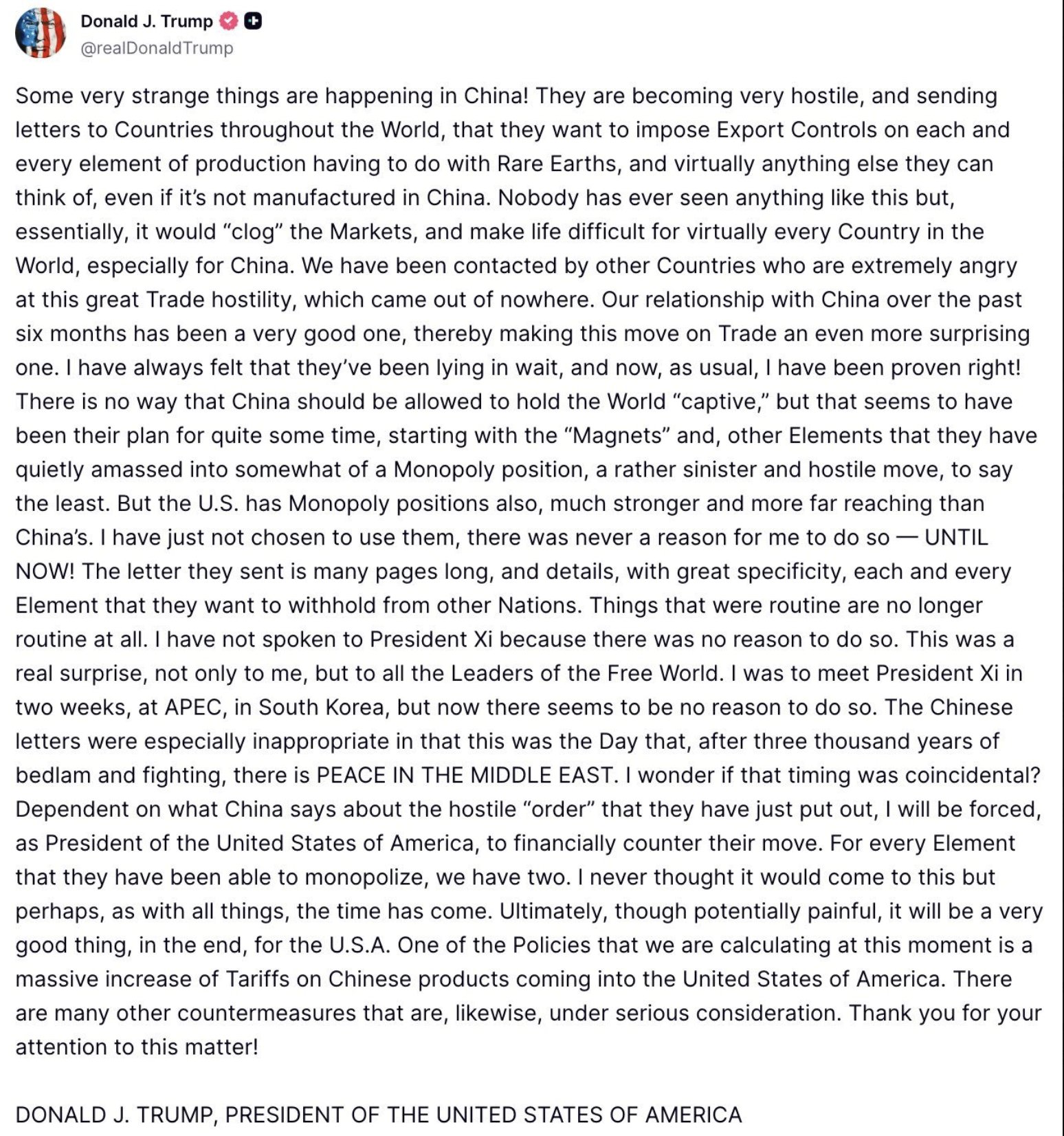 特朗普在帖子中提到,中国最近对全球贸易市场的态度变得异常敌对,并且公布了一份长达数页的信函,详细列出拟实施出口管制的稀土金属清单,这些金属包括对电子、国防等关键产业至关重要的材料。特朗普强调,这一决定对全球贸易产生重大影响,尤其对美国和中国自身的经济造成了不小的冲击。