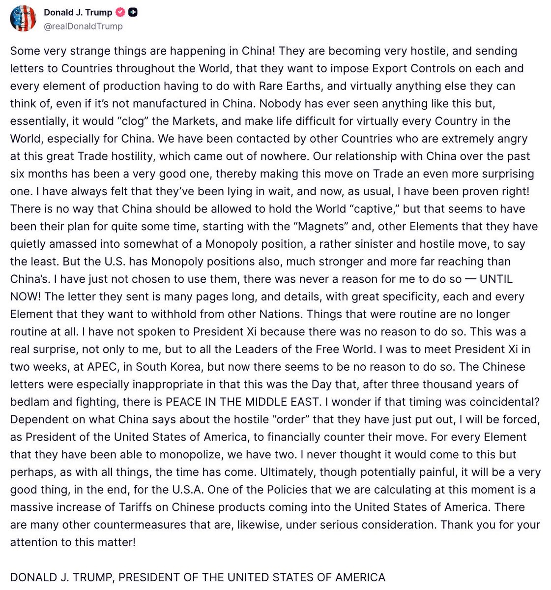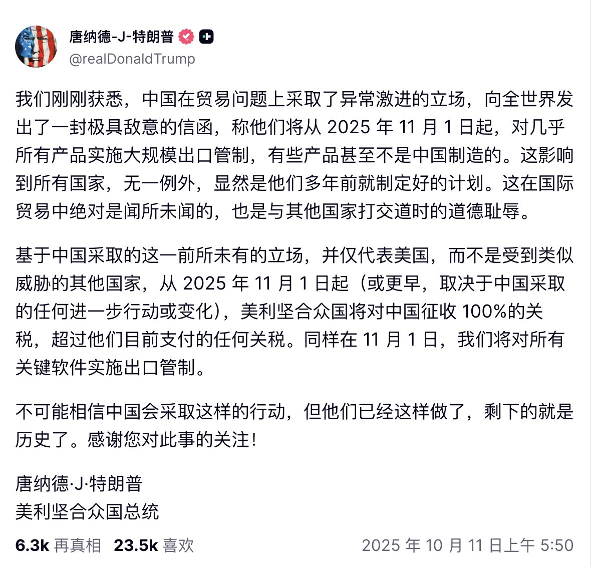 特朗普当天早些时候在社媒发文称,他已没有必要在本月底与习近平会面,还恫言将大幅度提高对华关税。他在发出新威胁的几个小时后就宣布对中国额外征收100%的关税,并对“所有关键软件”实施出口管制。