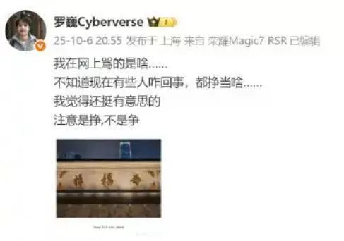 10月6日晚间,罗巍在微博发文:“我在网上骂的是啥……不知道现在有些人咋回事,都挣当啥……我觉得还挺有意思的,注意是挣,不是争 。”他还在评论区补充称,“挣的意思应该是收钱了,不然为啥这么前仆后继,奋勇争先。”